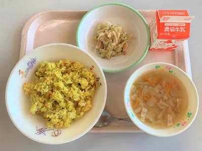 カレーピラフ、コンソメスープ、切干大根のごま酢和え、牛乳