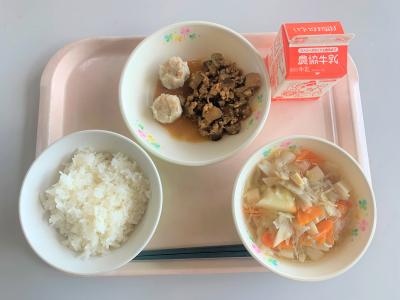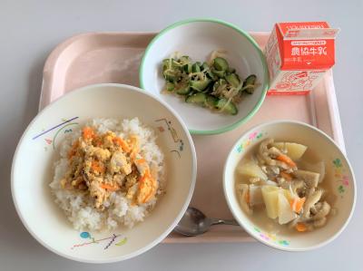 豚とじ丼、けんちん汁、きゅうりのピリから和え、牛乳