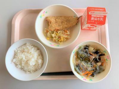 ごはん、めぎすのフライ、野菜炒め、春雨スープ、牛乳
