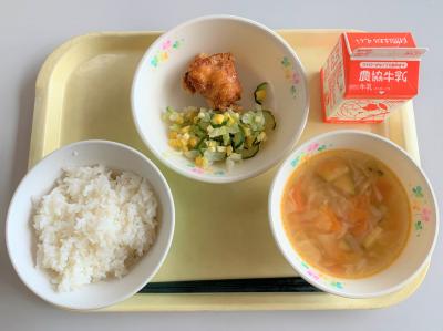 ごはん、タンドリーチキン、コーンサラダ、夏野菜のコンソメスープ、牛乳