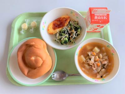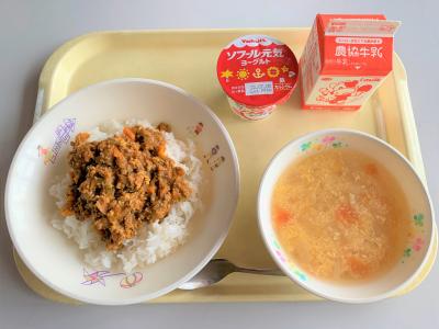 ドライカレー、トマトと卵のスープ(内浦産トマト使用)、ヨーグルト、牛乳