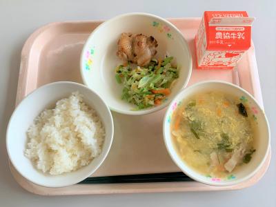 ごはん、鶏のマーマレード焼き、おひたし、卵スープ、牛乳