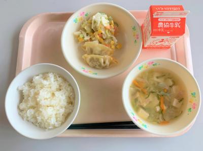 ごはん、焼きギョウザ、れんこんサラダ、中華スープ、牛乳