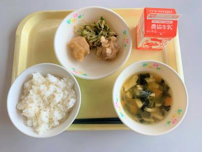 ごはん、鶏のレモン風味、きゅうりピリ辛和え、かぼちゃのみそ汁、牛乳