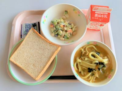 胚芽食パン(減量)、カレーうどん、ビーンズサラダ、ブルーベリージャム、牛乳