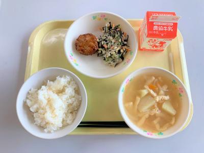 ごはん、鶏肉と野菜の焼きつくね、ひじきサラダ、みそ汁、牛乳