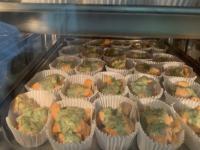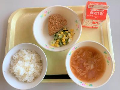 ごはん、かぼちゃひき肉フライ、コーンサラダ、ミネストローネ、牛乳