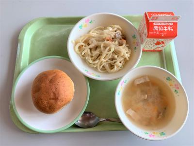 胚芽バンズ、たけのことキャベツのクリームスパゲティ、麹のスープ、牛乳