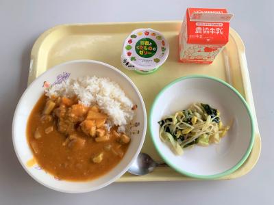 チキンカレー、もやしのナムル、野菜とくだもののゼリー、牛乳