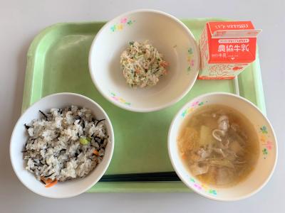 ひじきごはん、バンバンジーサラダ、チゲ風みそ汁、牛乳