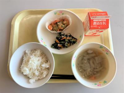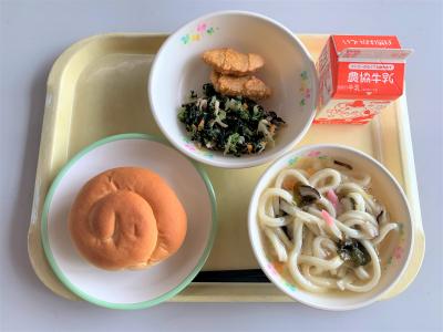 ミルクロール、チキンナゲット、ほうれん草のごま和え、わかめうどん、牛乳