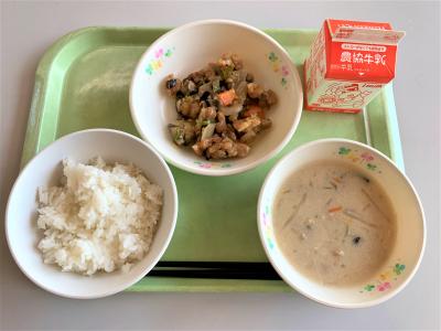 ごはん、鶏肉とれんこんの中華炒め、豆乳ごま担々スープ、牛乳