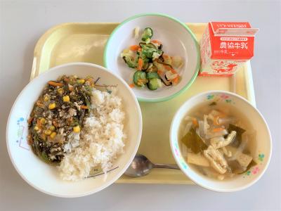 ごはん、ユーリンチー、磯辺和え、卵スープ、牛乳