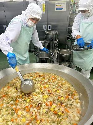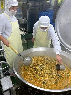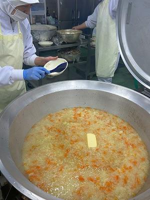今日の汁物は「キムチチゲ」です。とうふやあさり、はくさい、小松菜などとキムチが入っています。最後にごま油をいれ、風味を出しています。