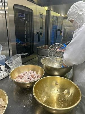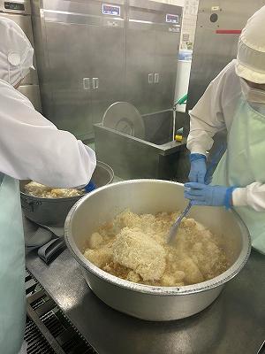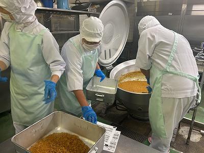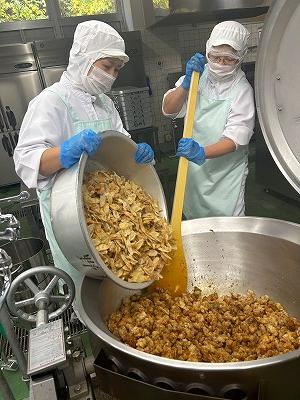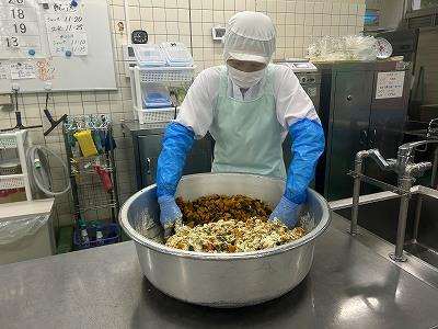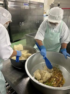 今日は、「秋の香りごはん」です。さつまいもやしめじ、ごぼうなど今がおいしい食材がたっぷり入っています。さつまいもは手切りで角切りにし、オーブンで焼いています。ごはんは、淡口しょうゆや酒、こんぶを入れて炊き、味付けした具を混ぜ込んでいます。