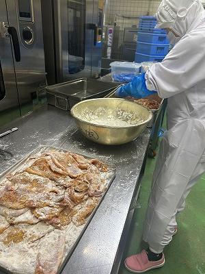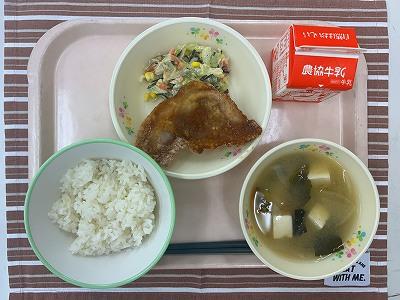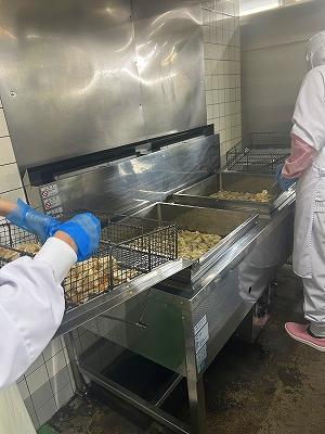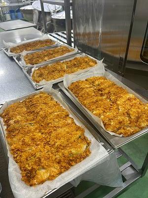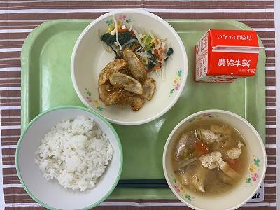 今日の主菜は、「豚肉のくわ焼き」です。くわ焼きとは、昔鍬の上で、野生の動物を焼いて食べたのが始まりだそうです。給食では、豚肉に下味をつけ、衣をつけ揚げました。揚げたものに甘辛いタレをかけてあります。