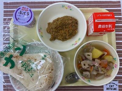 今日は、月に2回あるパンの日です。今日は「ナン」にしました。カレーミートは、レンズ豆という豆も入っています。