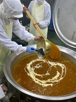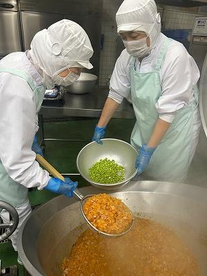今日の主食は、「野菜ピラフ」です。給食では、洋風の混ぜごはんのときには、ごはんを炊くときに麦とコンソメを入れて炊きます。具は別の釜で調理し、炊けたごはんに混ぜ込んで仕上げます。