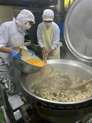 今日の給食は、「ハロウィン」の行事食です。副菜は、ハロウィンを意識して「かぼちゃサラダ」です。大量のかぼちゃを角切りにして、オーブンで焼いてから冷まします。焼くことで甘味が出ておいしく仕上がりました(^^)