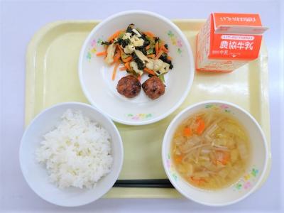 ごはん、れんこん入り肉団子の照り焼き風、小松菜の煮びたし、とり野菜、牛乳