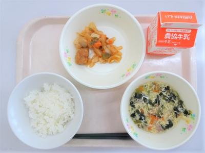 ごはん、酢豚、トックスープ、牛乳