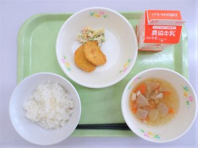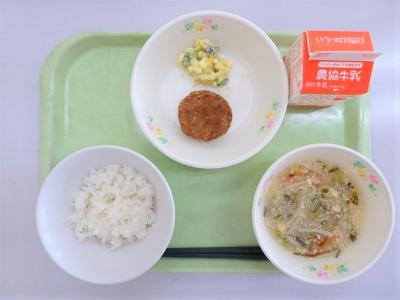 ごはん、メンチカツ、パンプキンサラダ、サンラータン、牛乳
