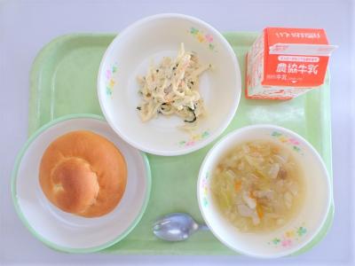 ミルクロール、鮭ときのこのクリームスパゲティ、かぶとウインナーのスープ、牛乳