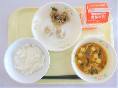 ごはん、ポークシュウマイ、しらたきのチャプチェ、豆腐のカレー煮、牛乳