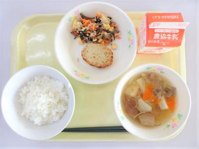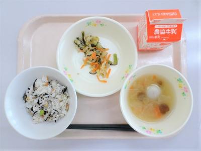ひじきごはん、豚キムチ炒め、いものこ汁、牛乳