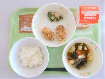 ごはん、鶏のから揚げ、ゆかりあえ、すまし汁、ふりかけ、牛乳