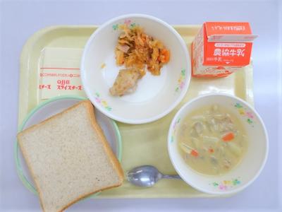 はいが食パン、鶏肉のマーマレード焼き、切干のアラビアータ風、根菜のカレーチャウダー、スライスチーズ、牛乳