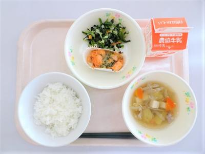 ごはん(ひゃくまん穀)、鮭のみそマヨ焼き、おひたし、豚汁、牛乳