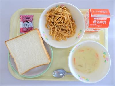 ミルク食パン、ミートソーススパゲティ、コーンスープ、チョコクリーム、牛乳