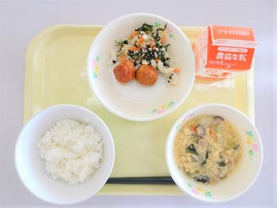 ごはん、肉団子のケチャップあんかけ、白和え、卵とじ、牛乳