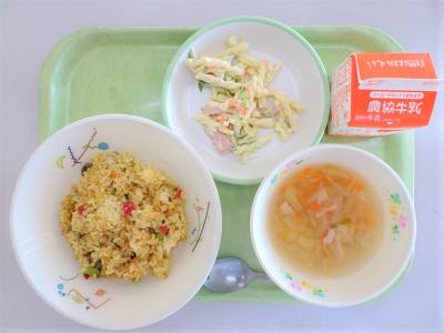 カレーピラフ、マカロニサラダ、コンソメスープ、牛乳