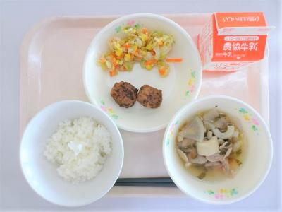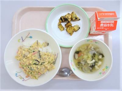 親子丼、みそけんちん汁、大学いも、牛乳