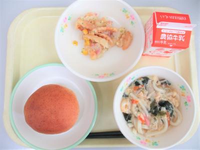 はいがバンズ、チーズポテト、かきたまうどん、牛乳