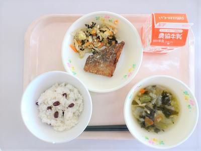 小豆ごはん、ぶりのいしる風味揚げ、あいまぜ、みそ汁、牛乳