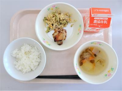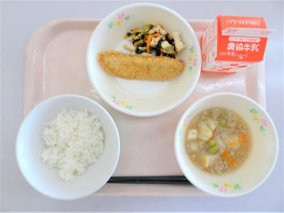 ごはん(ひゃくまん穀)、とびうおのフライ、小松菜の煮びたし、じゃがいものそぼろ煮、牛乳