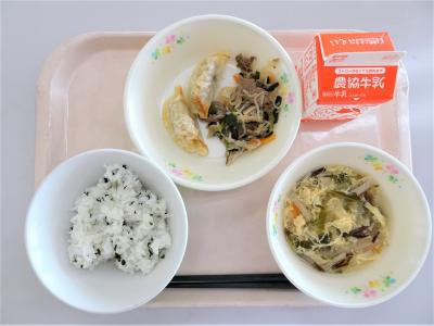 わかめごはん、焼きギョウザ、しらたきのチャプチェ、サンラータン、牛乳
