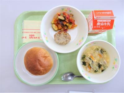 はいがバンズ、ハンバーグ、ラタトゥイユ、たまごスープ、スライスチーズ、牛乳