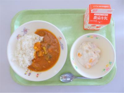 ごはん、さといもコロッケ、そうめんかぼちゃのごま酢和え、お月見汁、お月見デザート、牛乳