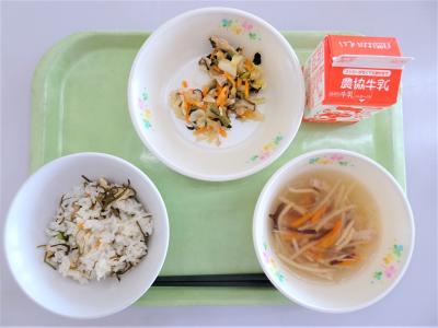 大豆と昆布のまぜごはん、豚キムチ炒め春雨スープ、牛乳