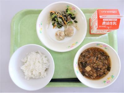 ごはん、シュウマイ、糸寒天サラダ、マーボーなす、牛乳
