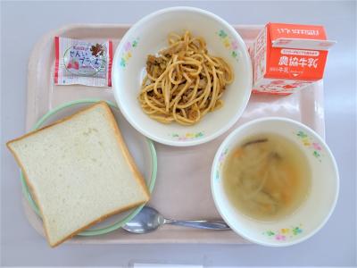 ミルク食パン、夏野菜のミートソーススパゲティ、麹のスープ、いちごジャム、牛乳