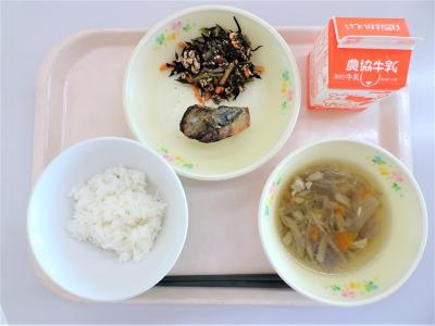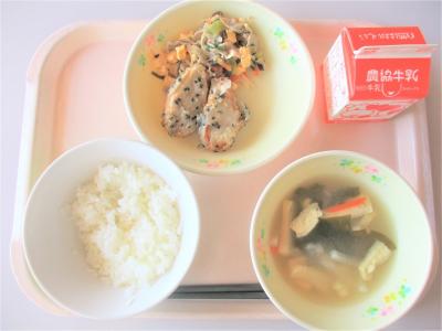 ごはん、魚の麹焼き、きくらげの彩り炒め、鶏とごぼうのすまし汁、牛乳