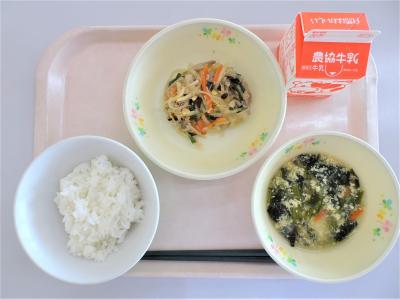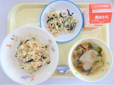 小松菜とひき肉のチャーハン、五目なます、ワンタンスープ、牛乳