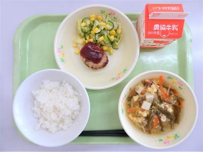 ごはん、ハンバーグ、コーンサラダ、茎ワカメとキムチのスープ、牛乳