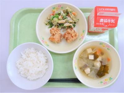 ごはん、鶏のからあげ、菜の花とたけのこのごま風味サラダ、みそ汁、牛乳