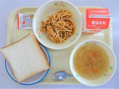 ミルク食パン、ミートソーススパゲティ、コンソメスープ、りんごジャム、牛乳